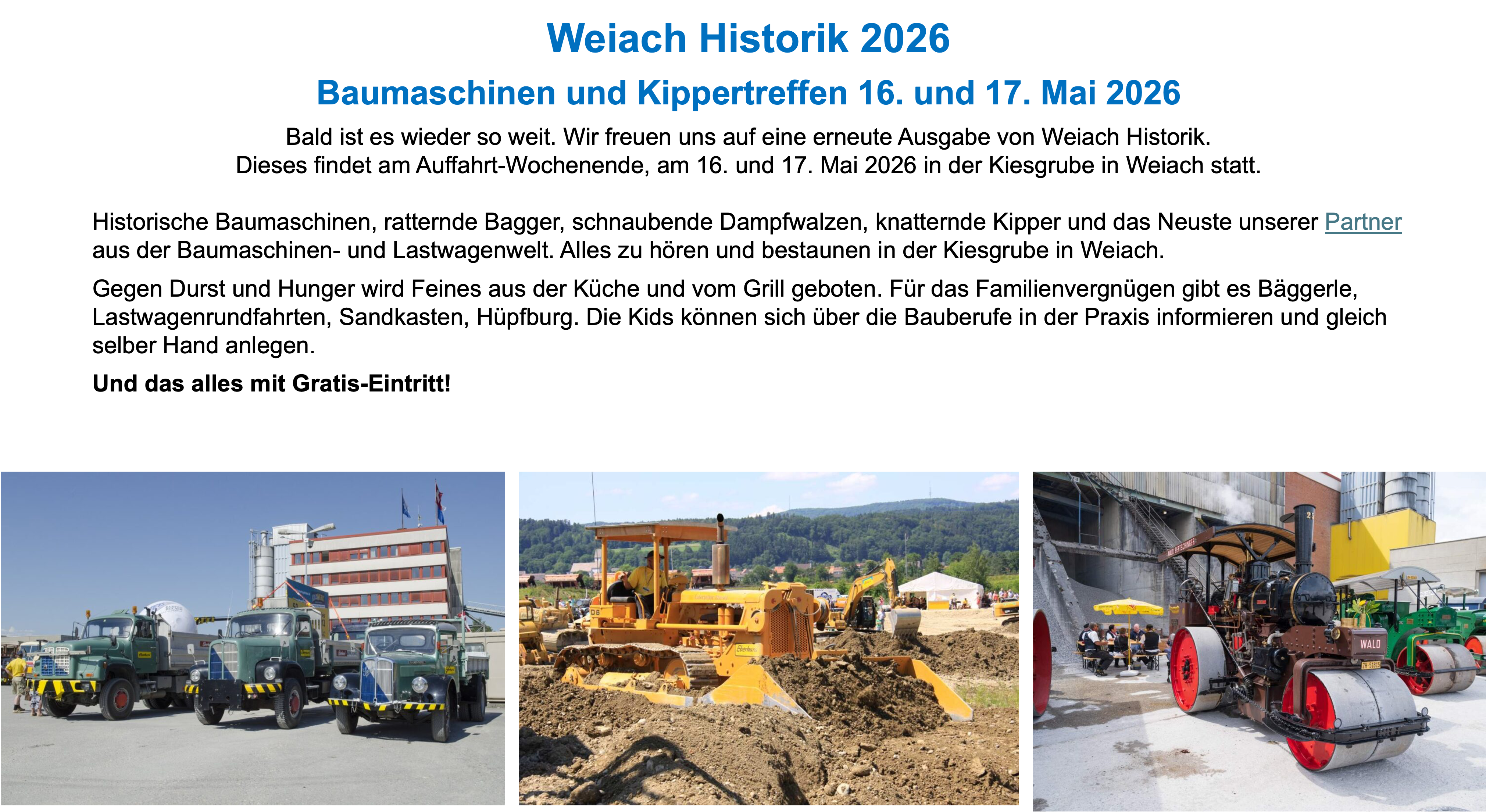 - Historische Baumaschinen, ratternde Bagger, schnaubende Dampfwalzen, knatternde Kipper und das Neuste unserer Partner aus der Baumaschinen- und Lastwagenwelt. Alles zu hören und bestaunen in der Kiesgrube in Weiach